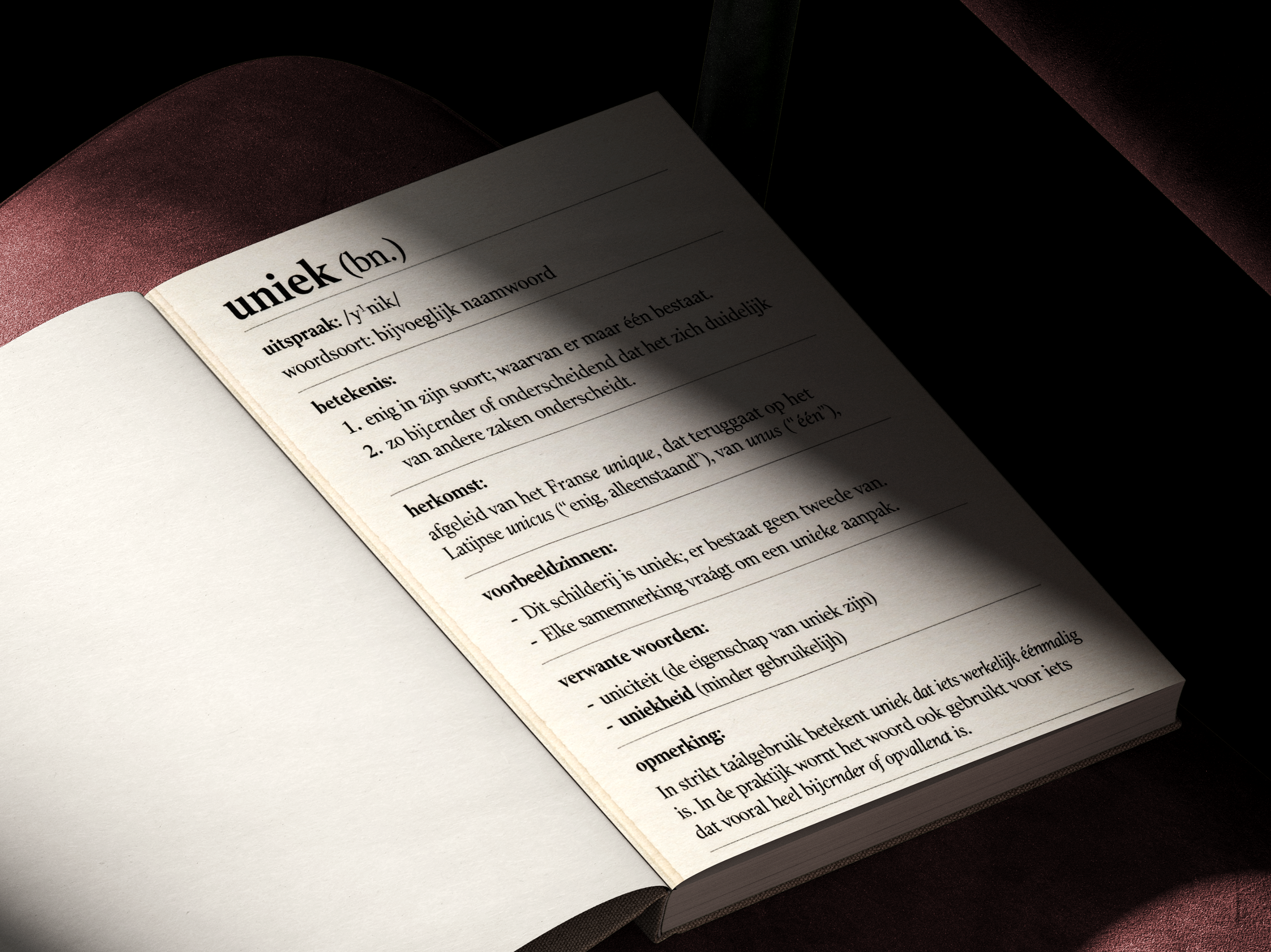 Uniek betekent: enig in zijn soort. Iets dat uniek is, zie je niet overal terug. Het heeft iets eigens, iets wat het onderscheidt van de rest. Dat kan een opvallend detail zijn, een bijzondere vorm of gewoon een gevoel dat je erbij krijgt.